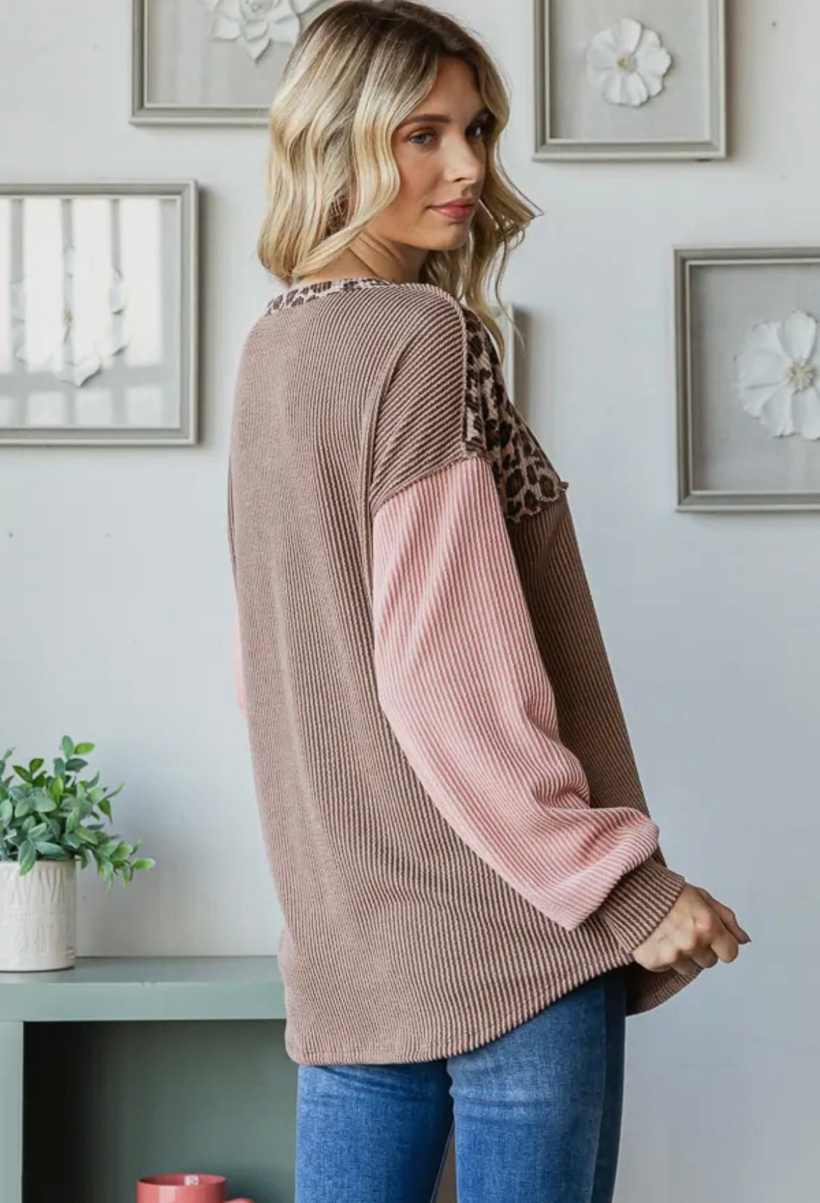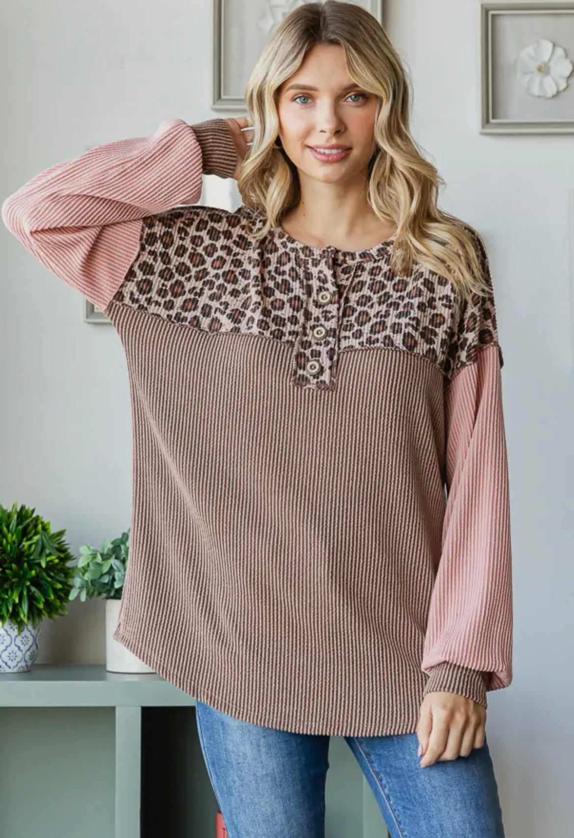 An animal print top featuring a rib contrast, round neck, button front, drop shoulder, exposed stitch, long sleeves, and a relaxed fit.