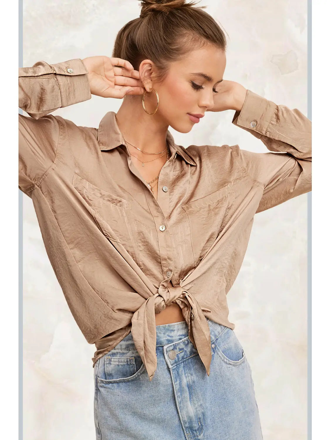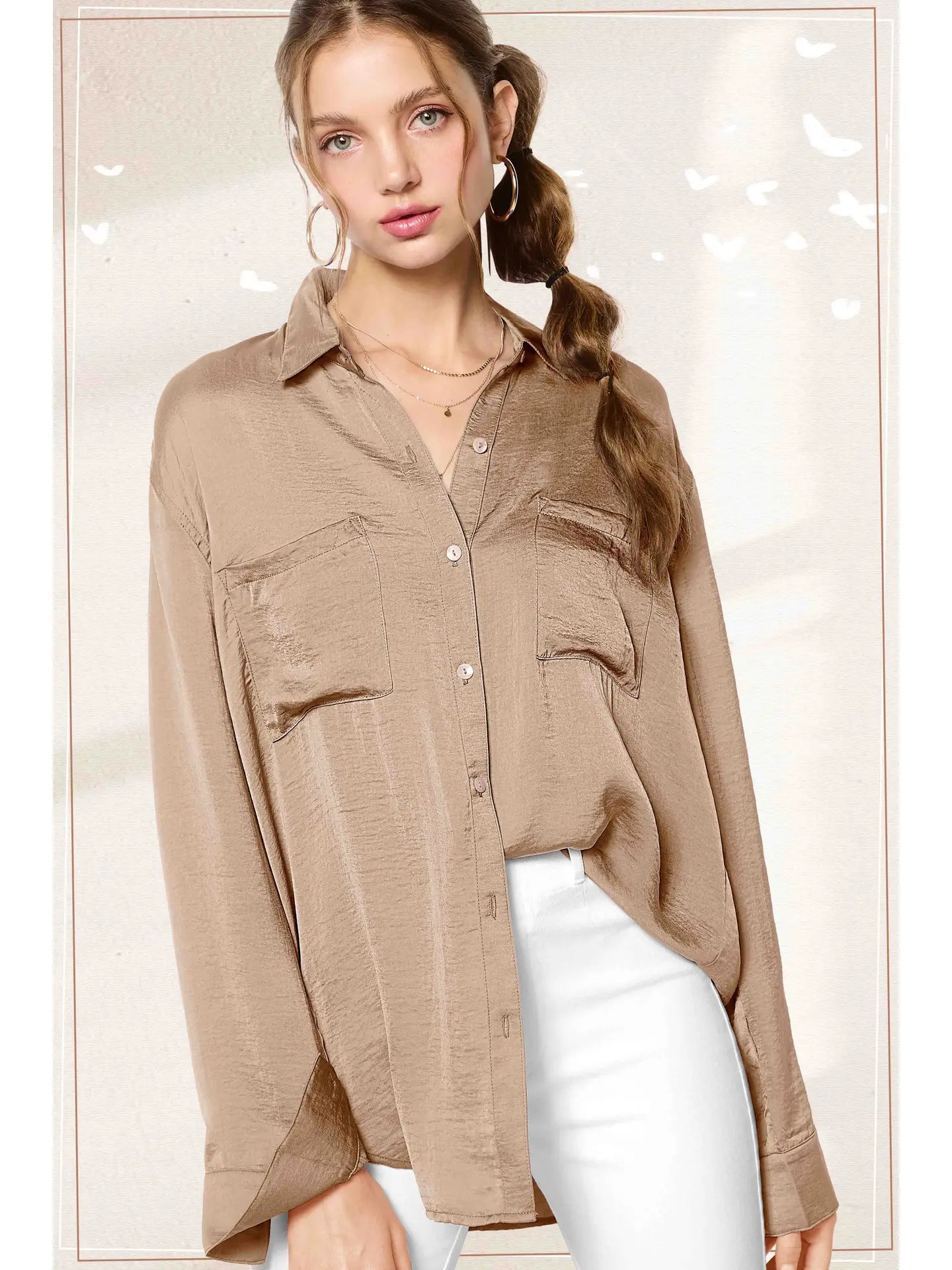 An essential button-down from our shirts collection featured in a silky fabrication and lightweight design with a chic collared neckline and drop-shoulder sleeves. This billowy button-down can be layered up or down and worn for every season. Match with your favorite bottom and shoes for a variety look.