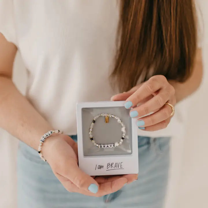 Joshua 1:9 “Have I not commanded you? Be strong and courageous. Do not be frightened, and do not be dismayed, for the Lord your God is with you wherever you go.” He makes you brave. Let the promise that He is with you wherever you go make you bold and brave. You have nothing to fear because He goes before you and walks with you. When you feel afraid, move forward in faith knowing that He will never leave or forsake you. The more you step, the more confident you will become. Remember, some of the greatest things are on the other side of fear. Details: -beaded stretch bracelet - 6.75" before stretching- size fits most -verse reference on attached gold tag -polaroid inspired packaging -personal note compartment inside -verse details on back