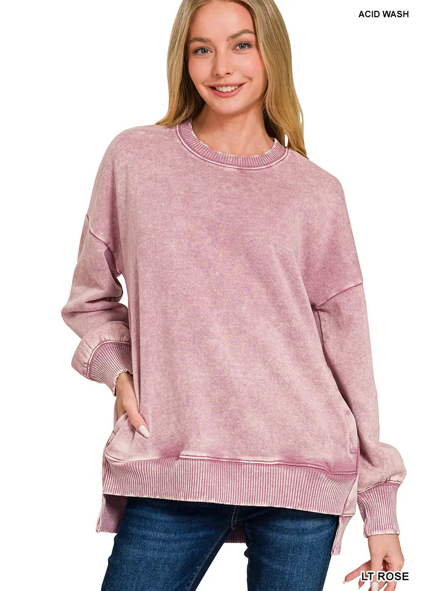 ACID WASH FLEECE HI-LOW HEM PULLOVER WITH POCKETS