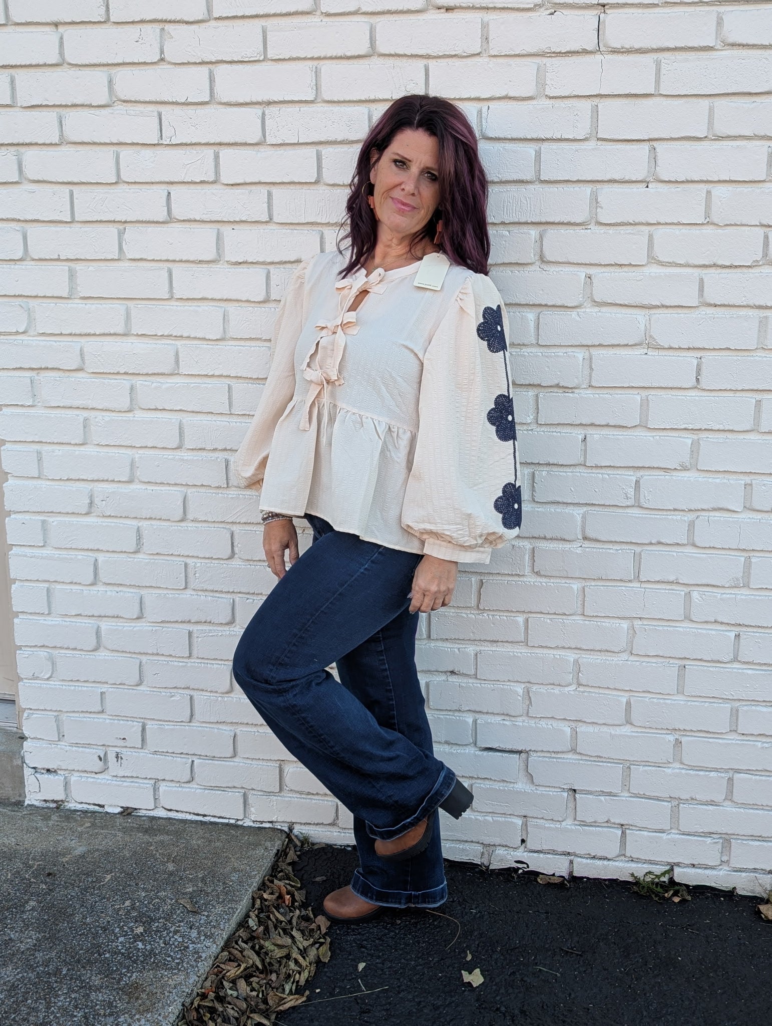 Floral embroidered 3/4 puff sleeves peplum top with front bow tie detail. - Model is 5'10'' and is wearing a Small. - Model is 5'7'' and is wearing a Small