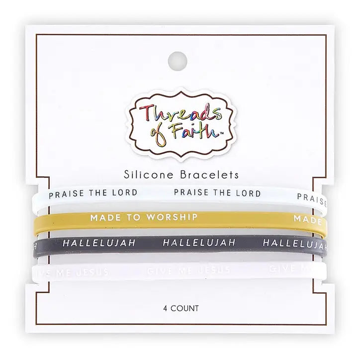 These sets of silicone bracelets come with 4 uniquely colored styles. This set features bracelets which read: "Praise the Lord", "Made to Worship", "Hallelujah", and "Give Me Jesus". Comes on a backer card for easy display. • Material: Silicone • Size: 7-1/2" Dia