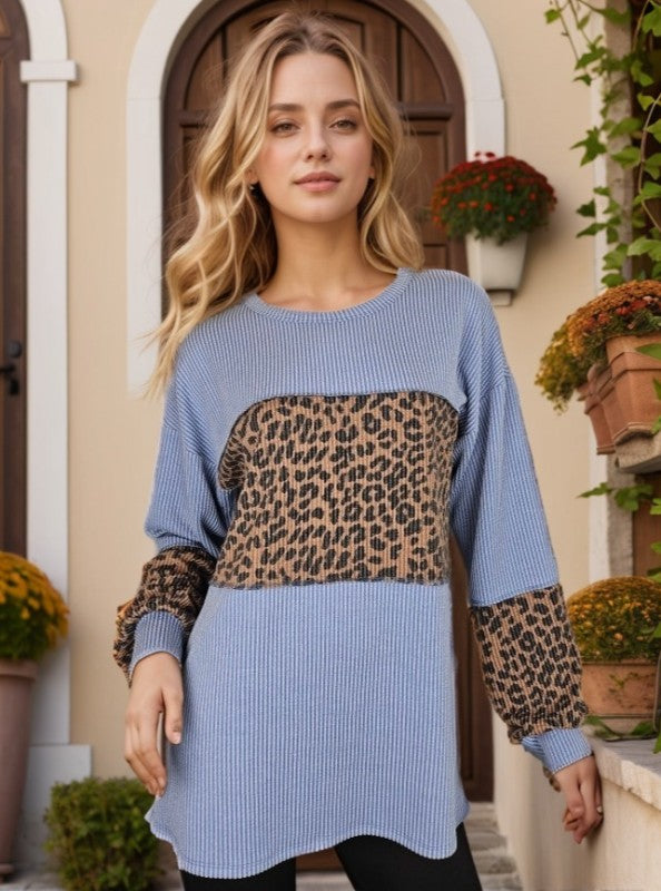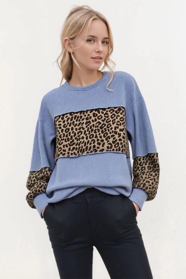 - LONG PUFF SLEEVE ROUND NECK SOLID URBAN RIBBED AND ANIMAL PRINT CONTRAST TOP WITH STITCH DETAIL PLUS SIZE
