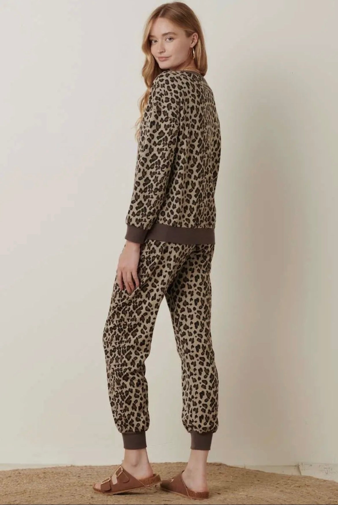Detail: leopard printed french terry pullover with round neck, long sleeves, and kangaroo pocket